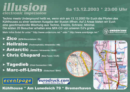 Techno meets Underground heißt es, wenn sich am 13.12.2003 für Euch die Pforten des Kühlhouses zu einer weiteren Ausgabe der illusion öffnen. Auf 2 Areas bieten wir Euch eine geschmackvolle Mischung aus Techno, Electro, Schranz, Minimal.