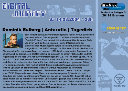 Zum Auftakt der neuen Veranstaltungsreihe haben wir für Euch einen ganz besonderen Gast eingeladen. Uns beehrt an diesem Abend "Dominik Eulberg", der demnächst auch regelmäßig im neuen Club von Sven Väth zu hören sein wird. Seine Infizierung mit der elektronischen Musik beginnt bereits in seiner Kindheit durch das stetige Hören der HR3-Clubnight. Im Alter von 15 entschließt er sich Platten zu kaufen und das Auflegen zu erlernen. 1995 kauft er sein erstes Equipment, um selber Musik zu produzieren. Später beteiligt er sich auch an einem Plattenladen und tritt regelmäßig als DJ oder Live-Act auf Veranstaltungen mit u.a. Tok Tok, Mark Spoon, Rush, Talla 2XLC, Tom Wax, Marco Cannata, Frank Lorber, Toni Rios auf. Bis zu seinem Umzug nach Bonn hat er bereits eine illustre Karriere als immer wieder gern gesehener DJ und Live-Computermusiker aufs Parkett gelegt. Seine musikalischen Aktivitäten decken ein reiches Spektrum an elektronischer Musik ab. Daraus resultierten so fruchtbare Kollaborationen auf Labels wie "Trapez", "Traumschallplatten", "Ware", "Raum", "Sniper" oder "ZYX". Abgerundet wird dieser Abend von den hauseigenen Dj's Antarctic und Tagedieb, die zuletzt den Undercore Wagen auf der Vision Parade 2004 beschallt haben.