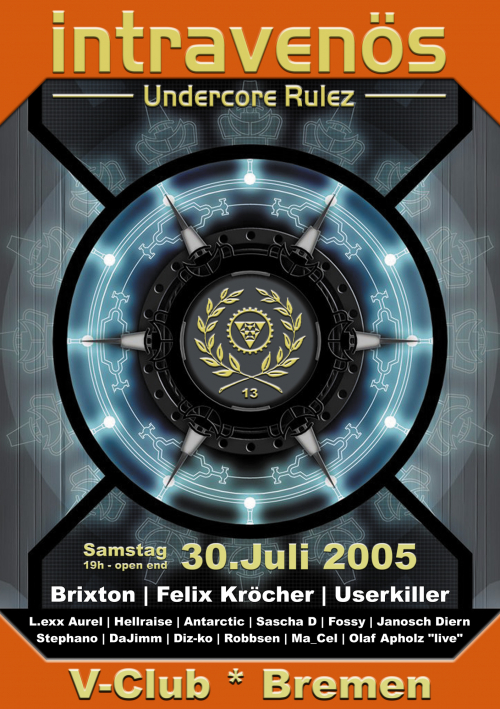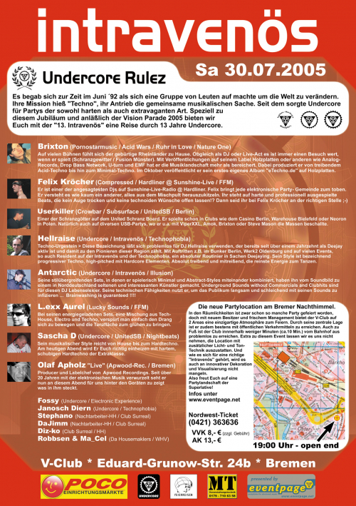 Es begab sich zur Zeit im Juni '92 als sich eine Gruppe von Leuten auf machte um die Welt zu verändern. Ihre Mission hieß "Techno", ihr Antrieb die gemeinsame musikalischen Sache. Seit dem sorgte Undercore für Partys der sowohl harten als auch extravaganten Art. Speziell zu diesem Jubiläum und anläßlich der Vision Parade 2005 bieten wir Euch mit der "13.Intravenös" eine Reise durch 13 Jahre Undercore.