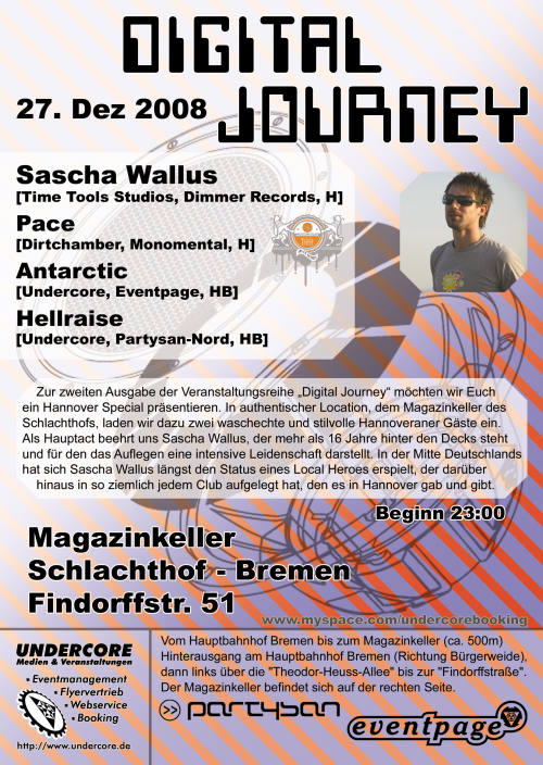 Zur zweiten Ausgabe der Veranstaltungsreihe "Digital Journey" möchten wir Euch ein Hannover Special präsentieren. In authentischer Location, dem Magazinkeller des Schlachthofs, laden wir dazu zwei waschechte und stilvolle Hannoveraner Gäste ein. Als Hauptact beehrt uns Sascha Wallus, der mehr als 16 Jahre hinter den Decks steht und für den das Auflegen eine intensive Leidenschaft darstellt. In der Mitte Deutschlands hat sich Sascha Wallus längst den Status eines Local Heroes erspielt, der darüber hinaus in so ziemlich jedem Club aufgelegt hat, den es in Hannover gab und gibt. Derzeit ist der 32-Jährige in allen drei relevanten Clubs der Stadt, dem Kiez-Klub, der Factory und dem Liquid als Resident angestellt. Saschas Sound hat sich über die Jahre aus vielen elektronischen Stilrichtungen entwickelt. Ging es lange Zeit um volle Power und Gas geben ohne Ende, faszinieren ihn heutzutage eher minimalistische Tracks, die sein DJ-Set völlig verändert haben. Er arbeitet mit den Tracks Spannungsbögen heraus, die in Wellen kommen. So stecken inzwischen noch mehr Emotionen in seinen Sets, mit denen er ganz neue Möglichkeiten erhält, das Publikum zu fordern, anzutreiben und durchdrehen zu lassen. Eigene Minimal-Tracks mit Anspruch produziert er gemeinsam mit Ron Paul und Koproduzent Zajonc. Ihr langjähriger DJ-Kollege Roger Prinz hatte sie im Time Tools Studio zusammengebracht. Dort arbeitet er nun Tür an Tür mit Martin Buttrich, dem Produzenten von Timo Maas und Loco Dice. Der zweite Gast aus der niedersächsischen Landeshauptstadt ist Marcus Rajab alias Pace. Seine Sets umfassen Minimal Techno, Tech- und DeepHouse, sowie Detroit Einflüsse und organische Elemente. Die erste Festanstellung bekam Pace 2005 im damaligen Astra Club in Hannover. Gleichzeitig ging die erste eigene Veranstaltung "DIRTCHAMBER" an den Start. 2006 durfte er die Veranstaltung "TANZVERHALTEN" ins Apollo-Konzept einbauen, worauf ein Jahr danach die Resident-Anstellung in der "Liquid Lounge" folgte, welche bis heute andauert und ihn mittlerweile zu einem oft gebuchten DJ katapultieren ließ. Der musikalische Rahmen wird durch die hauseigenen Dj's Antarctic und Hellraise gebildet. Antarctic wird diese Veranstaltung mit den neusten und in Bremen nur selten gehörten Kreationen minimaler und abstrakter Tanzmusik eröffnen, um dann die Hannoveraner loszulassen, die dieser Veranstaltung den nötigen Kick geben und Euch auf dem Floor ordentlich durchkneten werden. Beendet wird dieser Abend dann vom Intravenös-Initiator DJ Hellraise. Anstatt seiner superschnellen, harten und bewährten XXL-Sets auf maximal getunten Technics, wird er die neuesten Techno-Produktionen aus Detroit in seine unverwechselbaren Mix-Skillz einhüllen. Das Ganze sollte Grund genug sein, den Keller zu stürmen, um dieses elektronische Spektakel gemeinsam mit Leben und Skurrilität auszufüllen ...