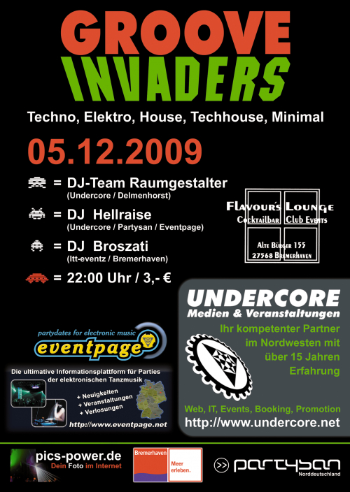 Taucht ein und gebt euch bei extra Licht und Soundinstallationen dem Groove hin auf der Groove Invaders am 05.12.09 um 22:00 Uhr in der Flavour's Lounge in Bremerhaven.