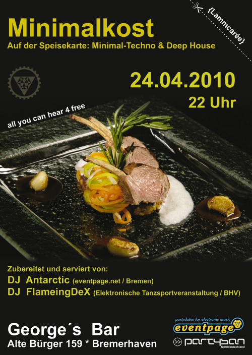 Er steht darüber hinaus seit über 20 Jahren hintern den Tellern und hat längere Zeit in San Francisco gelebt und als DJ gearbeitet. Seine amerikanischen House-Tunes werden auf dieser Veranstaltung mit dem neuesten minimalen Sound aus den deutschen Techno-Metropolen gepaart. Die DJ's werden hierzu an diesem Abend einen Balanceakt zwischen Listening-Music und tanzbaren Elementen herstellen. Die Vermischungen von Minimal Techno & House sowie Dub und Electro werden dabei einen eher angenehmen, atmosphärischen und groovigen Endlos-Sound ergeben.