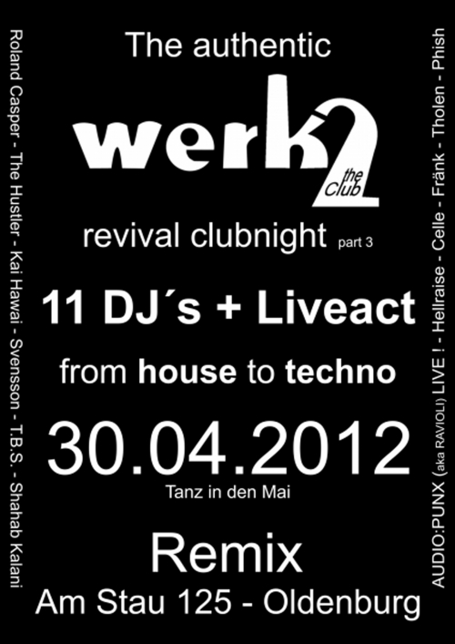 Das nehmen wir uns jetzt zum dritten mal, nach 2009 und 2010 zu Herzen und arbeiten in einer Gruppe interessierter Vergangenheitsschwelger an der "The Authentic WERK 2 Revival Clubnight - part3". Natürlich in der Originallocation, Am Stau 125 in Oldenburg.