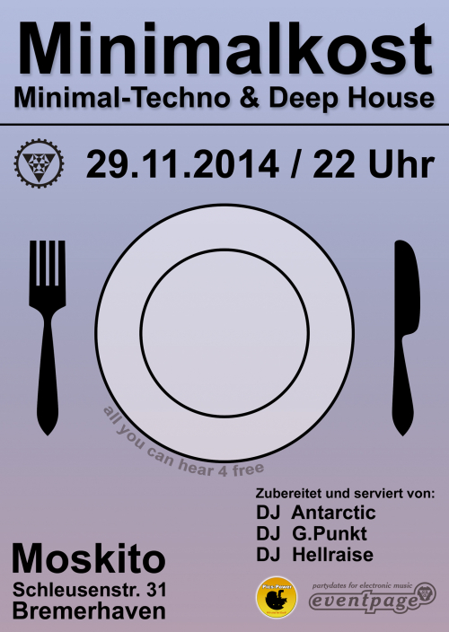 Entgegen des recht breit gehaltenen musikalischen Konzepts (Techno, Trance, Drum'n Bass) der Headphones, orientiert sich die Minimalkost sehr stark an Minimal-Techno, Deep-House und verwandten elektronischen Styles. Als Locations eignen sich besonders Bars, Lounges und kleine Clubs, die evtl. durch Projektionen, Deko-Elemente oder Lichteffekte ergänzt werden. Im Vordergrund steht bei dieser Veranstaltungsreihe nicht unbedingt der Tanz, sondern eine positive, entspannte und angenehme Atmosphäre in den Locations herzustellen. Die Gäste werden während eines Gesprächs oder beim Genuss eines Getränkes mit neuesten minimalistischen, groovigen und elektronischen Sounds verwöhnt. Den Dj?s bietet diese Plattform eine ganz besondere Auseinandersetzung mit ihrer Musik, da es nicht mehr nur auf die Tanz-Kompatibilität ankommt, sondern einen variantenreichen Sound zur Unterhaltung ihres Publikums zu erzeugen. Wir wünschen Euch auch weiterhin viel Vergnügen beim Besuch des Veranstaltungskonzepts des guten Geschmacks.