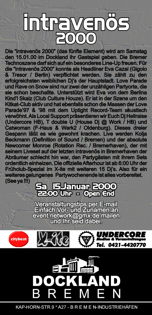 Die "intravenös 2000" (das fünfte Element) wird am Samstag den 15.01.00 im Dockland ihr Gastspiel geben. Die Bremer Technoszene darf sich auf ein besonderes Line-Up freuen. Für die "intravenös 2000" konnte als Headliner Eva Cazal (Gigolo & Tresor / Berlin) verpflichtet werden. Sie zählt zu den erfolgreichsten weiblichen Dj's der Hauptstadt. Love Parade und Rave on Snow sind nur zwei der unzähligen Partyorte, die sie schon beschallte. Unterstützt wird Eva von dem Berlina Kind'l Skaiz (Club Culture Houze). Er ist in der Szene um den Kitkat-Club aktiv und hat ebenfalls schon die Massen der Love Parade'97 & '98 mit dem Uptight Record-Team akustisch verwöhnt. Als Local Support präsentieren wir Euch Dj Hellraise (Undercore HB), T double U (House Dj @ Work / HB) und Catwoman (F-Haus & Werk2 / Oldenburg). Dieses dreier Gespann läßt es wie gewohnt krachen. Live werden Kolja Beckmann (Definition of Sound / Bremen) und der absolute Newcomer Monroe (Rotation Rec. / Bremerhaven), der mit seinem Liveset auf der letzten intravenös in Bremerhaven der Abräumer schlecht hin war, den Partygästen mit ihrem Sets ordentlich einheizen. Die offizielle Afterhour ist ab 6:00 Uhr der Frühclub-Spezial im X-ite mit weiteren 15 Dj's. Also fÜr ein weiteres gelungenes Partywochenende ist alles vorbereitet.