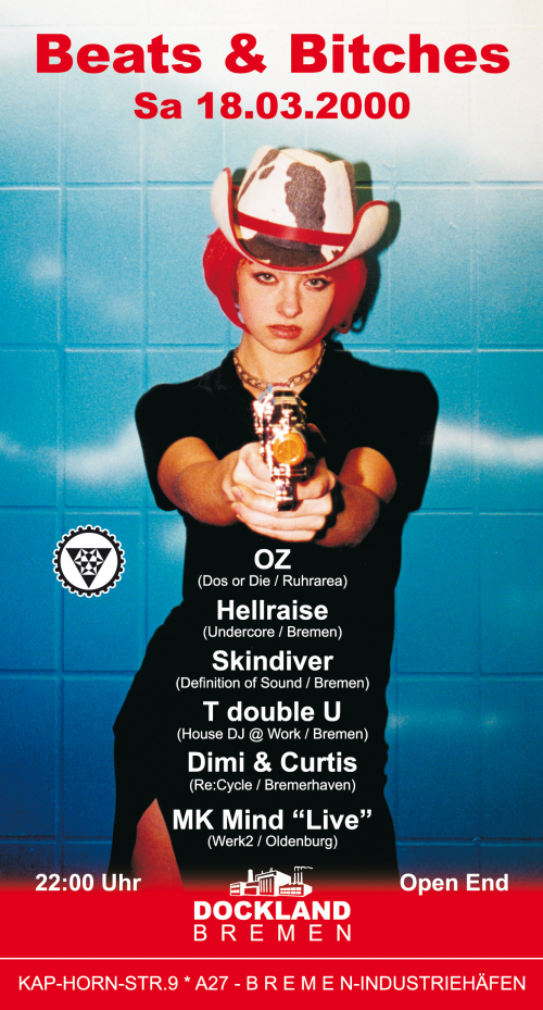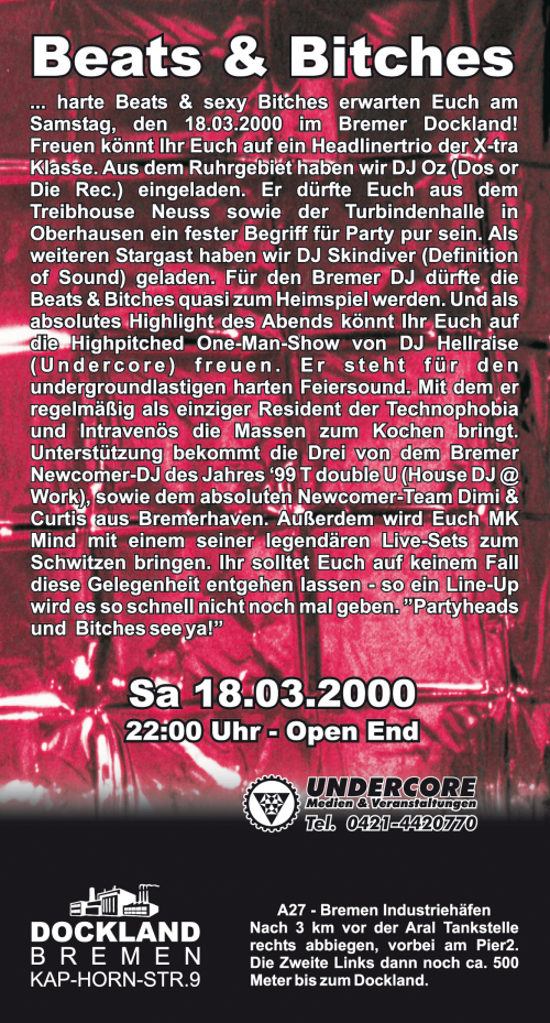 ... harte Beats & sexy Bitches erwarten Euch am Samstag, den 18.03.2000 im Bremer Dockland! Freuen könnt Ihr Euch auf ein Headlinertrio der X-tra Klasse. Aus dem Ruhrgebiet haben wir DJ Oz (Dos or Die Rec.) eingeladen. Er dürfte Euch aus dem Treibhouse Neuss sowie der Turbindenhalle in Oberhausen ein fester Begriff für Party pur sein. Als weiteren Stargast haben wir DJ Skindiver (Definition of Sound) geladen. Für den Bremer DJ dürfte die Beats & Bitches quasi zum Heimspiel werden. Und als absolutes Highlight des Abends könnt Ihr Euch auf die Highpitched One-Man-Show von DJ Hellraise (Undercore) freuen. Er steht für den undergroundlastigen harten Feiersound. Mit dem er regelmäßig als einziger Resident der Technophobia und Intravenös die Massen zum Kochen bringt. Unterstützung bekommt die Drei von dem Bremer Newcomer-DJ des Jahres ‘99 T double U (House DJ @ Work), sowie dem absoluten Newcomer-Team Dimi & Curtis aus Bremerhaven. Außerdem wird Euch MK Mind mit einem seiner legendären Live-Sets zum Schwitzen bringen. Ihr solltet Euch auf keinem Fall diese Gelegenheit entgehen lassen - so ein Line-Up wird es so schnell nicht noch mal geben. "Partyheads und Bitches see ya!"